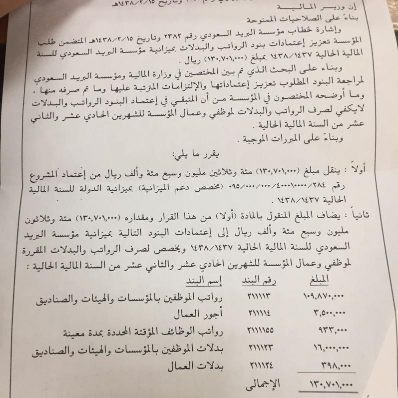 وين الي يقولون دخل البريد ست مليار والي يقول دخل البريد اربع مئة مليون ما يمكن يكون دخله بهالشكل وهم طالبين من وزارة المالية تعزيز لرواتب الموظفين والبدلات للهوامير الي بالبريد من كبار الموظفين والمستشارين و خلافه .