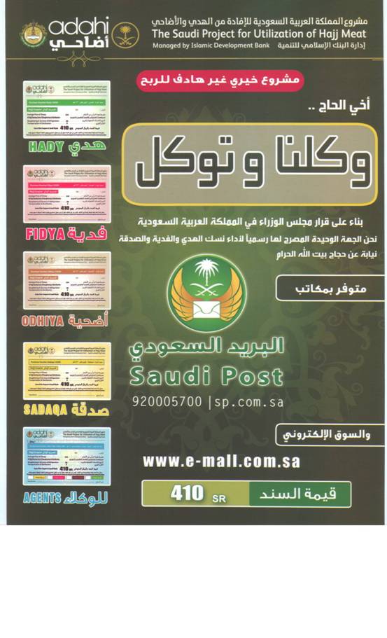 وكذلك بإمكانك شراء الفدي أو الأضحيه أو الصدقة وتعتبر مؤسسة البريد أول جهة رسمية مصرح لها بذلك