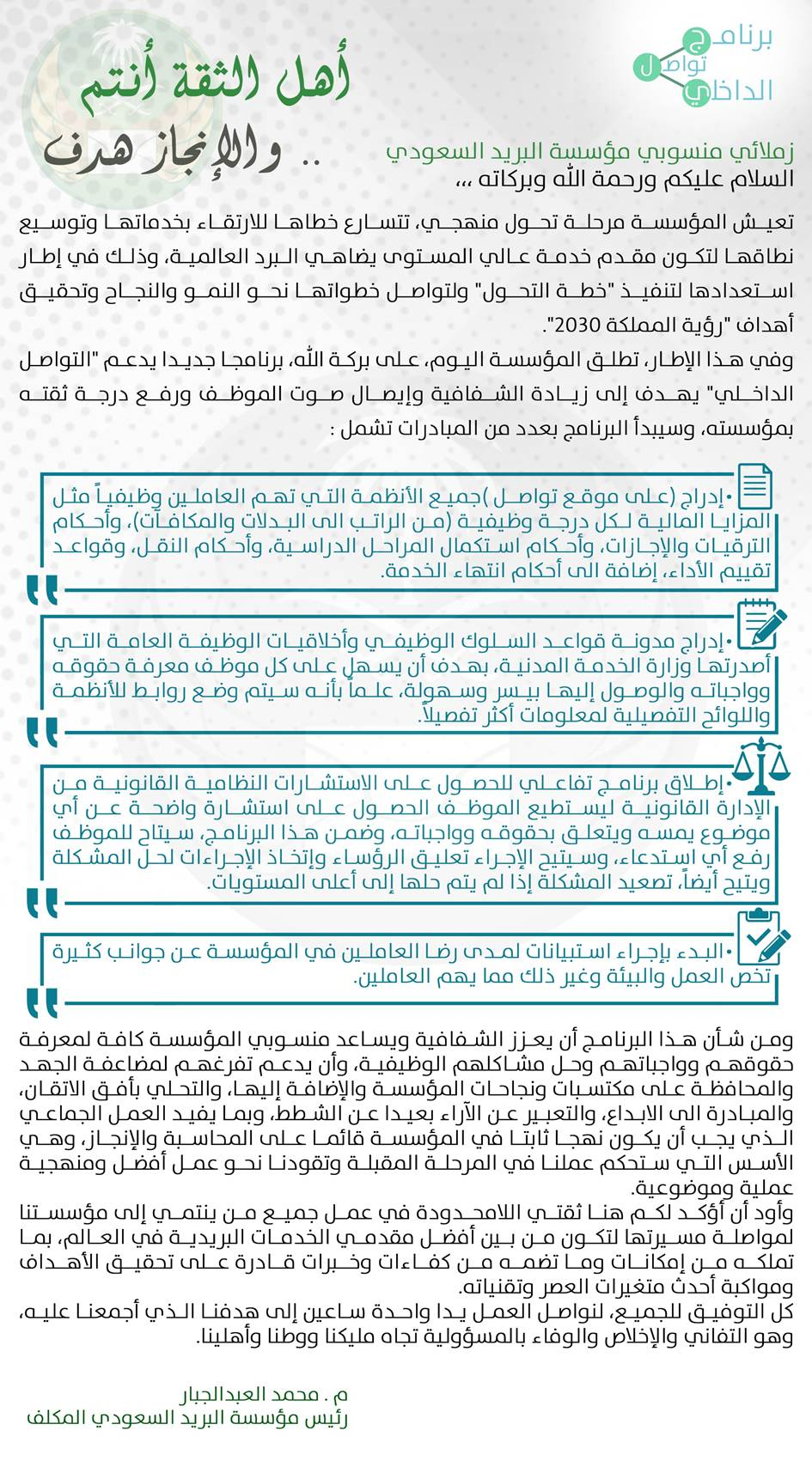 من أقوى مؤشرات الإصلاح في البريد السعودي على يد المهندس العبد الجبار هذه الرسالة الموجهة لمنسوبي البريد السعودي