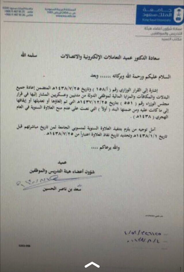 وصلتني هذه الصورة من خطاب جامعة الملك سعود والذي يتضمن اعادة العلاوة السنوية للموظفين