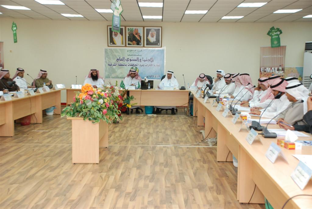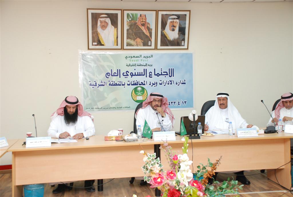 ترأس سعادة الأستاذ سعد بن عبدالرحمن العثمان مدير عام بريد المنطقة الشرقية صباح الثلاثاء 13/4/1433هـ الموافق 6مارس 2012م الاجتماع السنوي العام لمدراء الإدارات وبرد المحافظات بالمنطقة الشرقية الذي عقد بقاعة الاجتماعات بالدور السادس المجمع البريدي بالدمام بحضور مدير عام بريد المنطقة المساعد للعمليات البريدية الأستاذ احمد البليهد وسعادة مدير عام بريد المنطقة المساعد للشئون الإدارية والمالية وسعادة مدير عام بريد المنطقة المساعد لمراكز الخدمة ومشاركة مدراء الإدارات وبرد المحافظات والإدارات الإقليمية بالمنطقة ومركز التدريب البريدي .