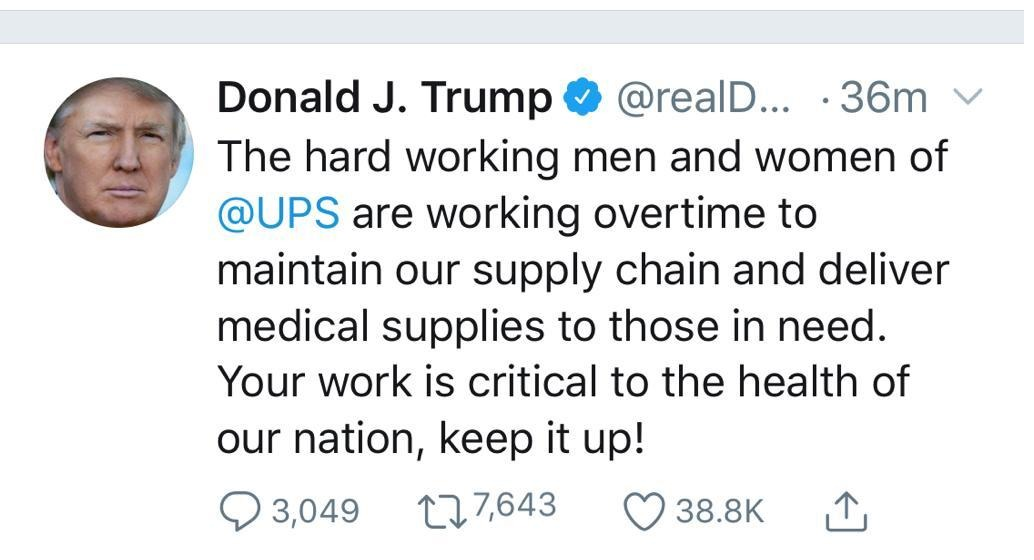 في تغريدة للرئيس الأمريكي دونالد ترامب أثنى على موظفي البريد الذين يعملون في اوقات اضافية لايصال المواد البريدية والدواء والغذاء إلى السكان :