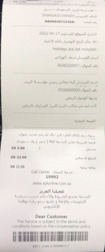 رسالتي هي مكتملة العنوان ، ومعنونة إلى رئيس مؤسسة البريد السعودي آنف أبانمي - الرياض ( كما هو موضح بالصورة )