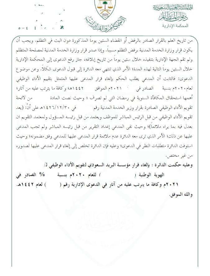 رقم 51934 والصادر بتاريخ 30/12/1426 وعلى المادة رقم 36/7 والتي تنص على أن يكون التقييم صادر من المدير المباشر للموظف يعني من تم تخفيض تقييمه من قبل مديره المباشر ماله شي ومن يثبت انه تم تقييمه من قبل غير مديره المباشر يتم الحكم في مصلحة الموظف ويتم الغاء التقييم الظالم للموظف.